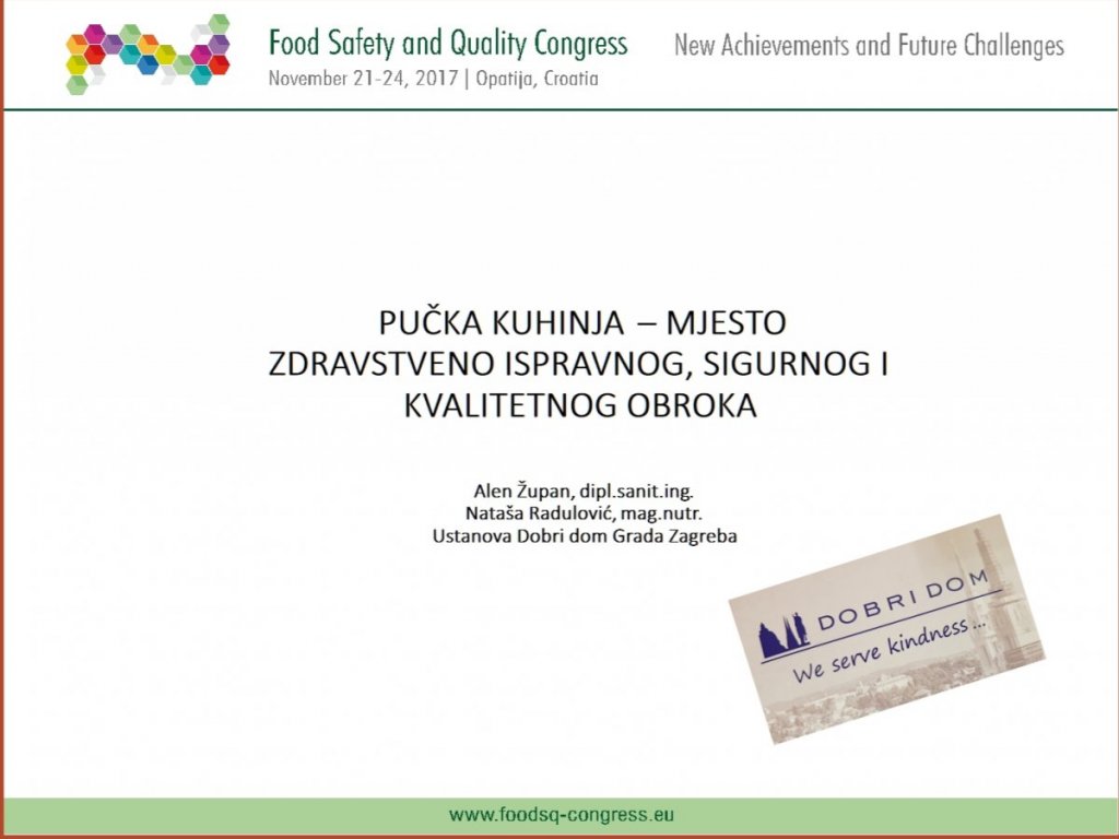 Ustanova je vrlo aktivno sudjelovala i u radu 1. Kongresa o sigurnosti i kvaliteti hrane – NOVA POSTIGNUĆA I BUDUĆI IZAZOVI, koji se održao u mjesecu studenom 2017. u Opatiji. Ispred Ustanove svoj rad predstavili su ravnatelj Ustanove Alen Župan i Nataša Radulović: PUČKA KUHINJA – MJESTO ZDRAVSTVENO ISPRAVNOG, SIGURNOG I KVALITETNOG OBROKA