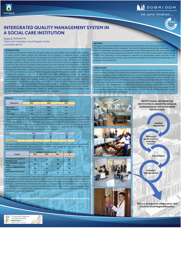 Polazeći od ključne pretpostavke kako je sigurnost hrane zajednička odgovornost države, proizvođača, distributera, struke, ali i samih potrošača, o stručnim i aktualnim temama u ovome području na ovogodišnjem Kongresu govorili su vrhunski predavači i sugovornici. Ovogodišnje izdanje Kongresa, na tragu je odaziva na Prvi Kongres, gdje je svoja znanja i iskustva u četiri dana razmijenilo preko 300 sudionika te 20 istaknutih gostujućih predavača iz zemlje i svijeta, okupilo je još brojnije predavače i stručnjake koji su potaknuli nove rasprave te ponudili najnovija saznanja o važnim temama u području sigurnosti i kvalitete hrane. U radu Kongresa ispred Ustanove vrlo aktivno su sudjelovali ravnatelj Ustanove Alen Župan, mag.soc.gerontologije i Nataša Radulović, mag.nutricionizma, te su imali izlaganje u vidu postera na temu: INETRGRATED QUALITY MANAGEMENT SYSTEM IN A SOCIAL CARE INSTITUTION.