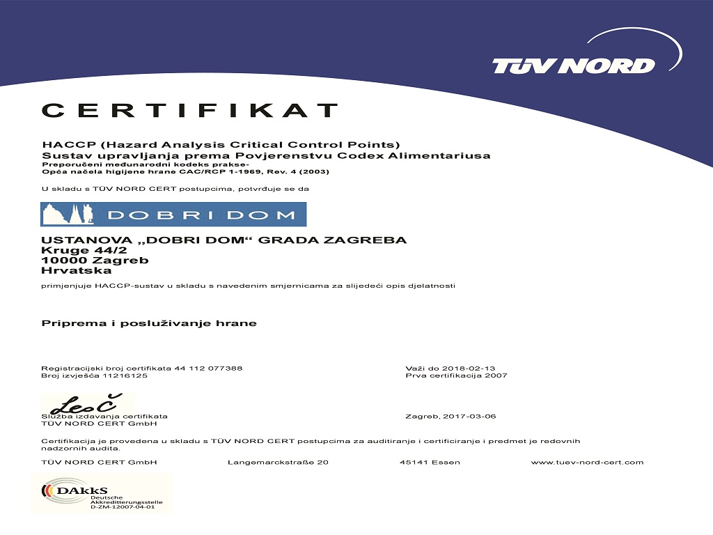Važno je istaknuti da je svaki obrok za sebe pripreman po istoj propisanoj proceduri i normativnim vrijednostima, koja je propisana Kuharicom Ustanove Dobri dom Grada Zagreba, temeljem implementiranog sustava HACCP-a (od 2007.), za koji je izvršena analiza obzirom na energetsku vrijednost te isti u potpunosti odgovaraju preporučenim dnevnim količinama prehrambenih tvari (Dietary reference intakes for energy, carbohydrate, fiber, fat, fatty ACIDS, Cholestrol, Protein and Amino Acids; Institut of Medicine, Food and Nutrition Bord; Washington, DC. QP141.D529 2005). Ustanova također posjeduje certifikat ISO 9001: 2008.