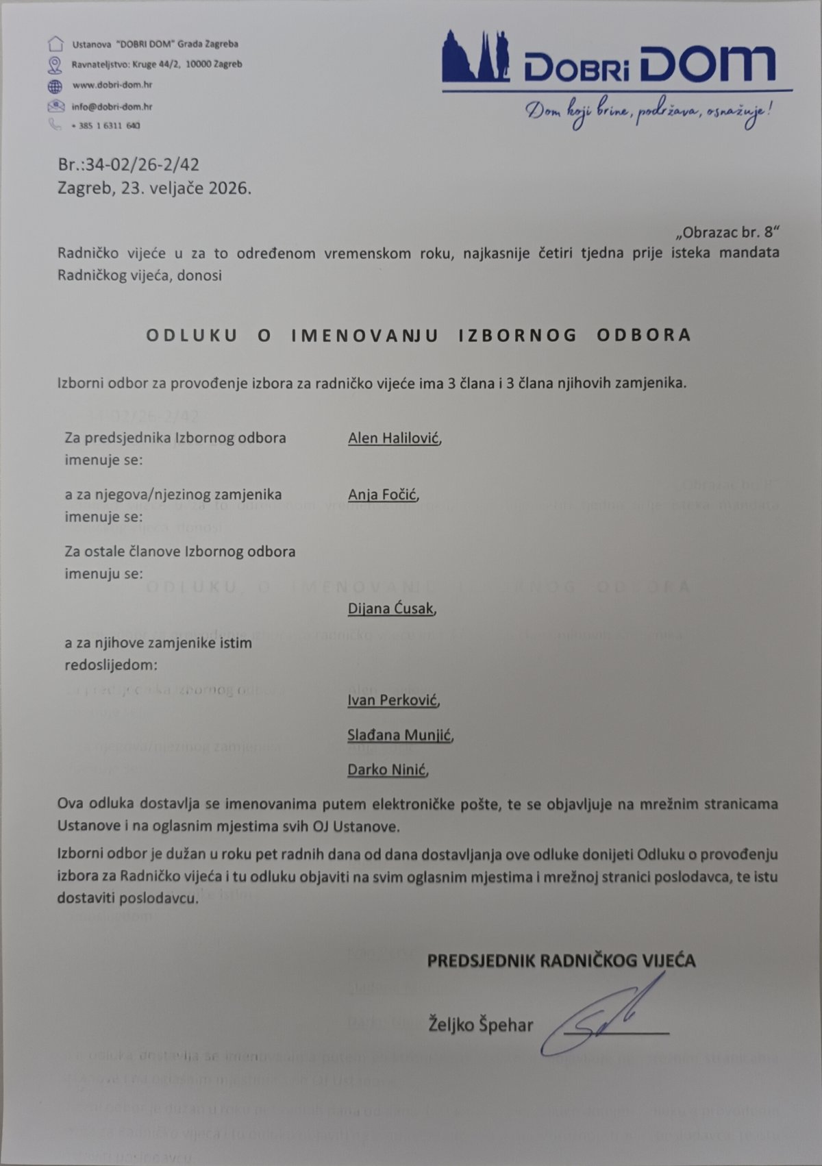 Dana 23. veljače 2026. donesena je Odluka o imenovanju članova Izbornog odbora za provođenje izbora za Radničko vijeće Ustanove Dobri dom Grada Zagreba.